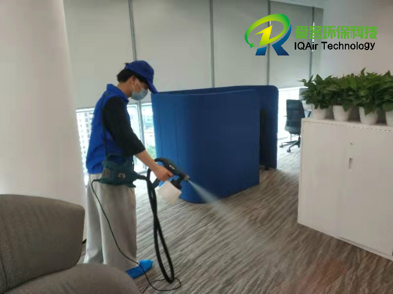 愛客工程師針對辦公區地毯、柜體、家具物表逐一噴灑愛客濃縮型異味分解酶(食品級)與強力TVOC清除劑(食品級),以消除化學異味分子,降解甲醛及TVOC。