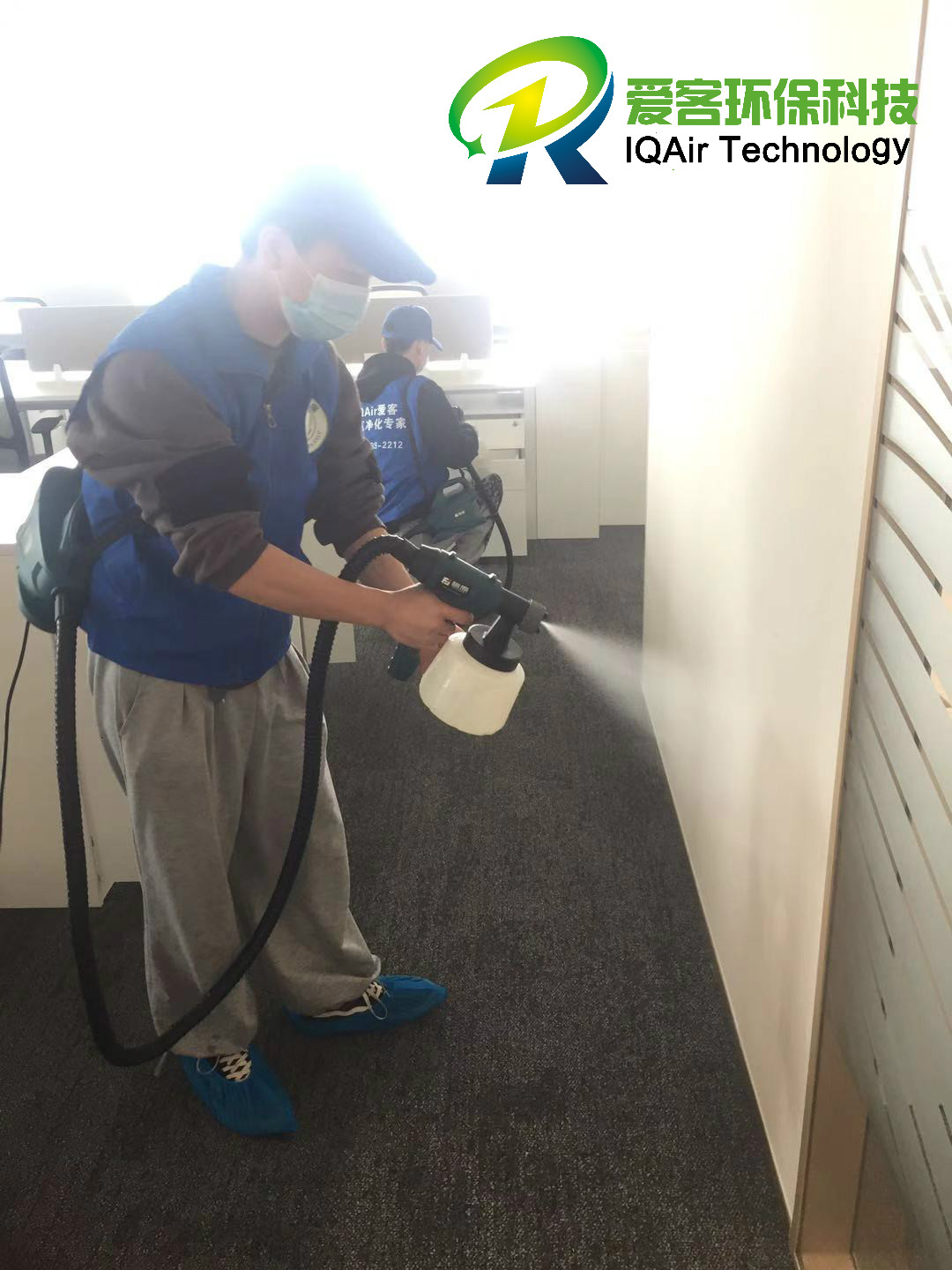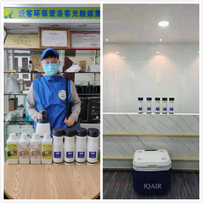愛客工程師對墻面、柜體等平整受光載體,噴涂愛客AK-172復合光觸媒(食品級) ,高分子生物酶(食品級),長時間持續消除分解甲醛、苯等揮發性有機物。