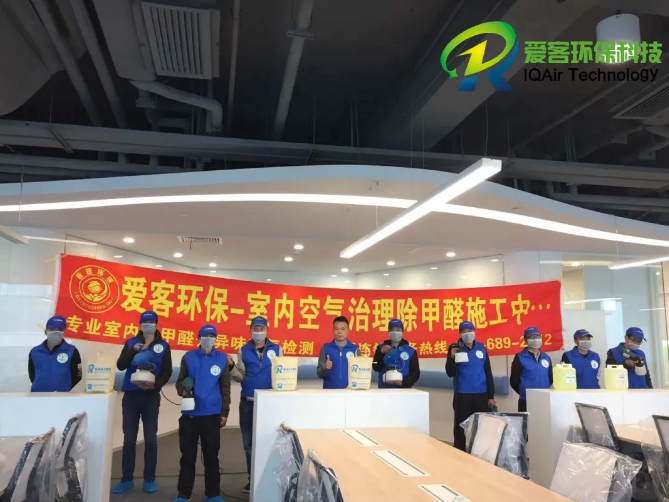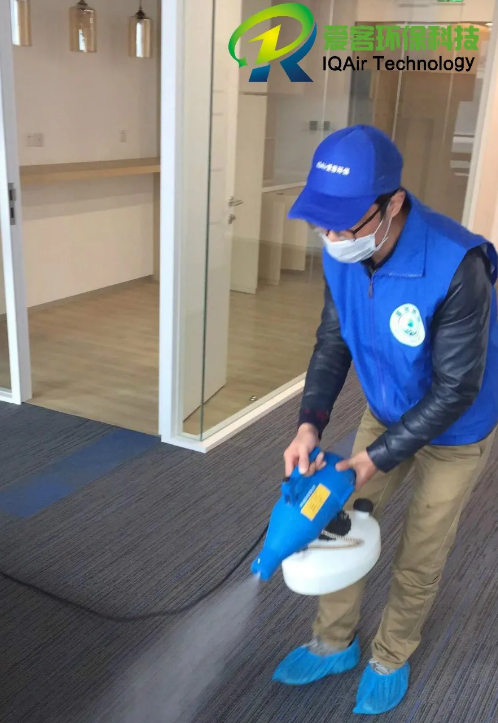 施工人員針對辦公區墻面、天花、地面、地毯、柜體、家具物表逐一噴灑愛洛客復合光觸媒和高分子生物酶,以消除異味分子,降解甲醛及TVOC。