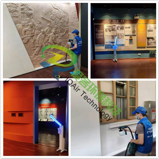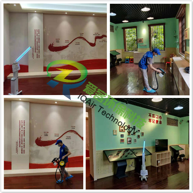 愛客工程師們對紀念館一、二樓展區地板、墻面、翻新門窗表面逐一噴灑愛客濃縮型異味分解酶(食品級)與強力TVOC清除劑(食品級),以消除化學異味分子,降解甲醛及TVOC。并結合紫外線燈進行殺菌消毒治理。