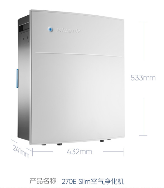 Blueair 布魯雅爾270E空氣凈化機,風量300m³/h,CADR值264m³/h。機身材質為合金鋼材質,環保大氣,造型時尚,適合20平米左右的居室使用。270E采用的是復合型的濾網,可以有效去除PM2.5,甲醛二手煙等有害物質。使用最佳面積是17-30平方。功能特點:除煙除塵,除螨殺菌,除甲醛,適用面積:17-30㎡,凈化技術:HEPA高效過濾器,活性炭,負離子,臭氧,風量:151-300立方米/小時,電源方式:交流電,適用對象:商用、家用。
