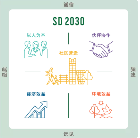 企業可持續發展五大策略支柱,分別是社區營造、以人為本、伙伴協作、環境效益和經濟效益。這五點,其實與LEED認證的綠色理念也極為契合。