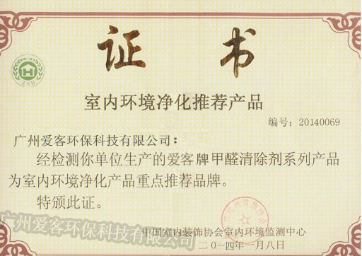 室內(nèi)環(huán)境凈化推薦產(chǎn)品榮譽(yù)證書