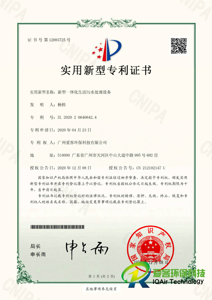 污水處理設備專利證書